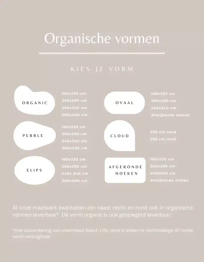 Onze vloerkleden zijn leverbaar in meer dan tien standaardmaten, ook rond. Daarnaast kunnen wij vrijwel ieder karpet helemaal op maat maken, dankzij onze eigen op-maat-productiefaciliteiten. Alle karpetten in alle maten bestel je eenvoudig en snel via onze webshop.