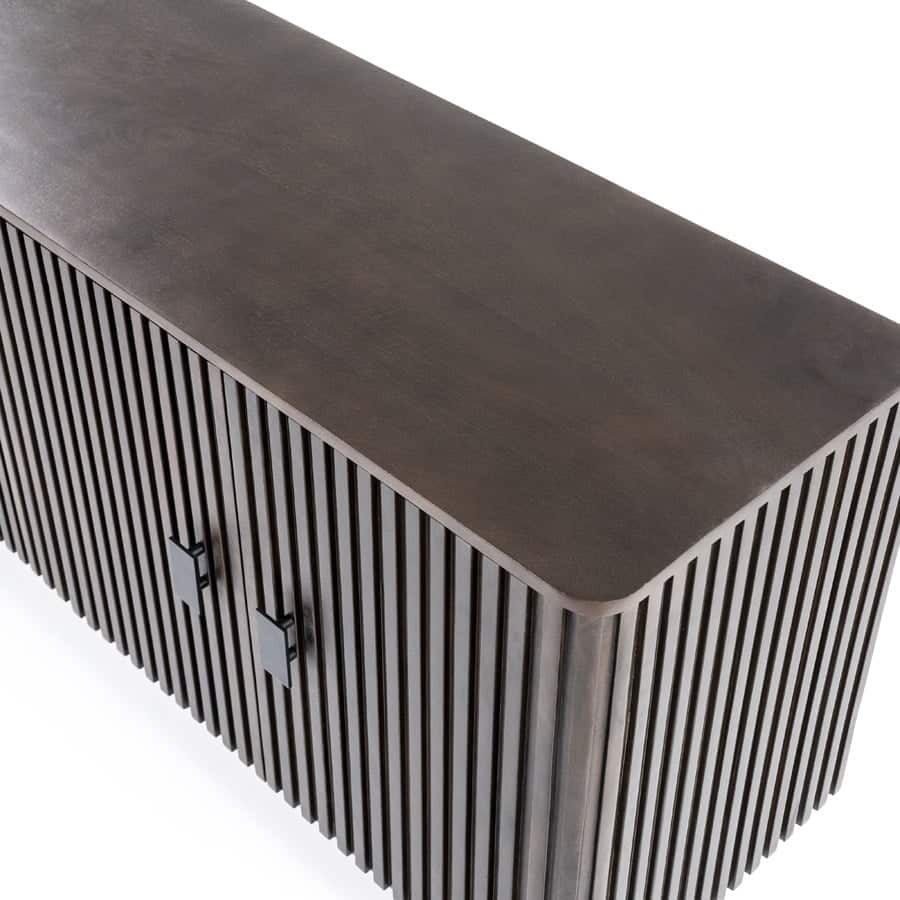 Het metalen onderstel biedt niet alleen een stevig fundament, maar geeft het dressoir ook een luchtige, moderne uitstraling. De metalen handgrepen sluiten perfect aan bij het stoere ontwerp en maken het openen van de deuren makkelijk. De geribbelde textuur van de deuren voegt een subtiele luxe toe, waardoor het dressoir niet alleen praktisch is, maar ook een statement piece in je interieur vormt.