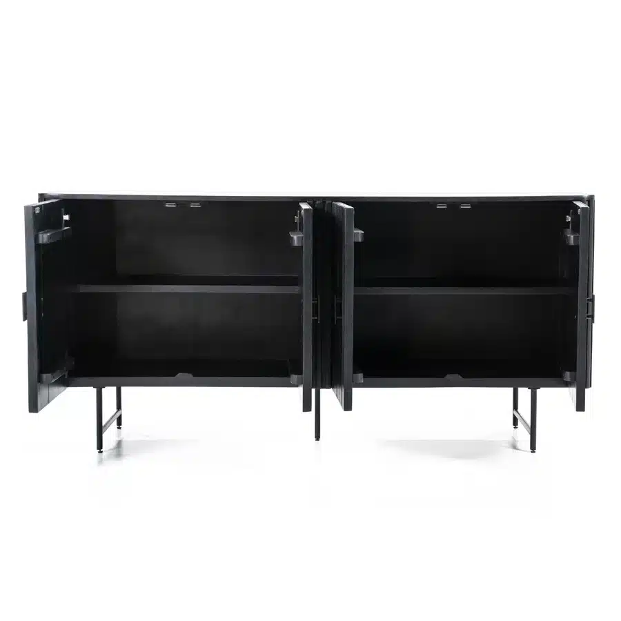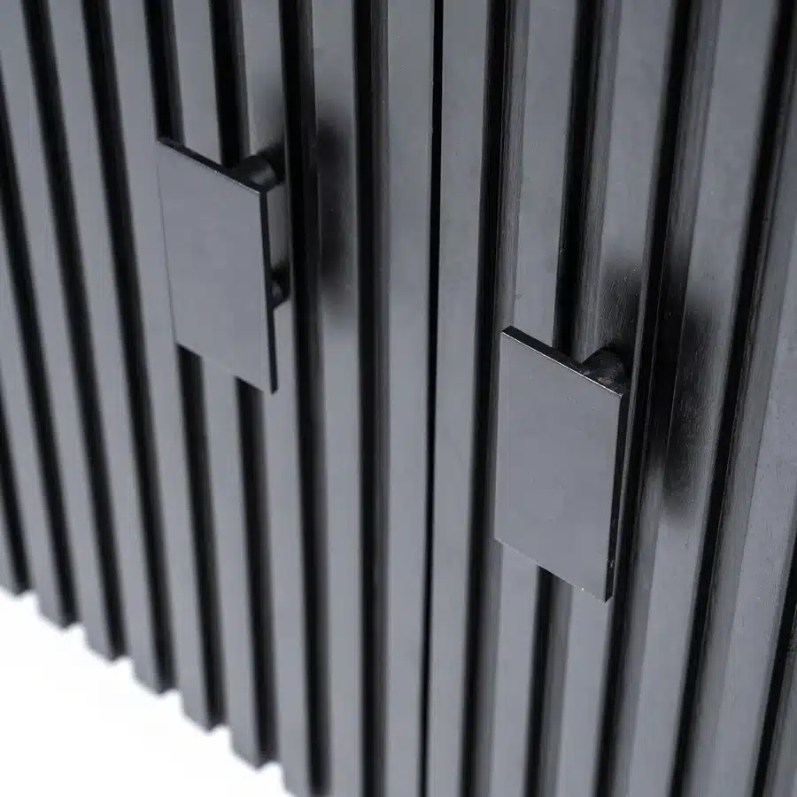 Het metalen onderstel biedt niet alleen een stevig fundament, maar geeft het dressoir ook een luchtige, moderne uitstraling. De metalen handgrepen sluiten perfect aan bij het stoere ontwerp en maken het openen van de deuren makkelijk. De geribbelde textuur van de deuren voegt een subtiele luxe toe, waardoor het dressoir niet alleen praktisch is, maar ook een statement piece in je interieur vormt.