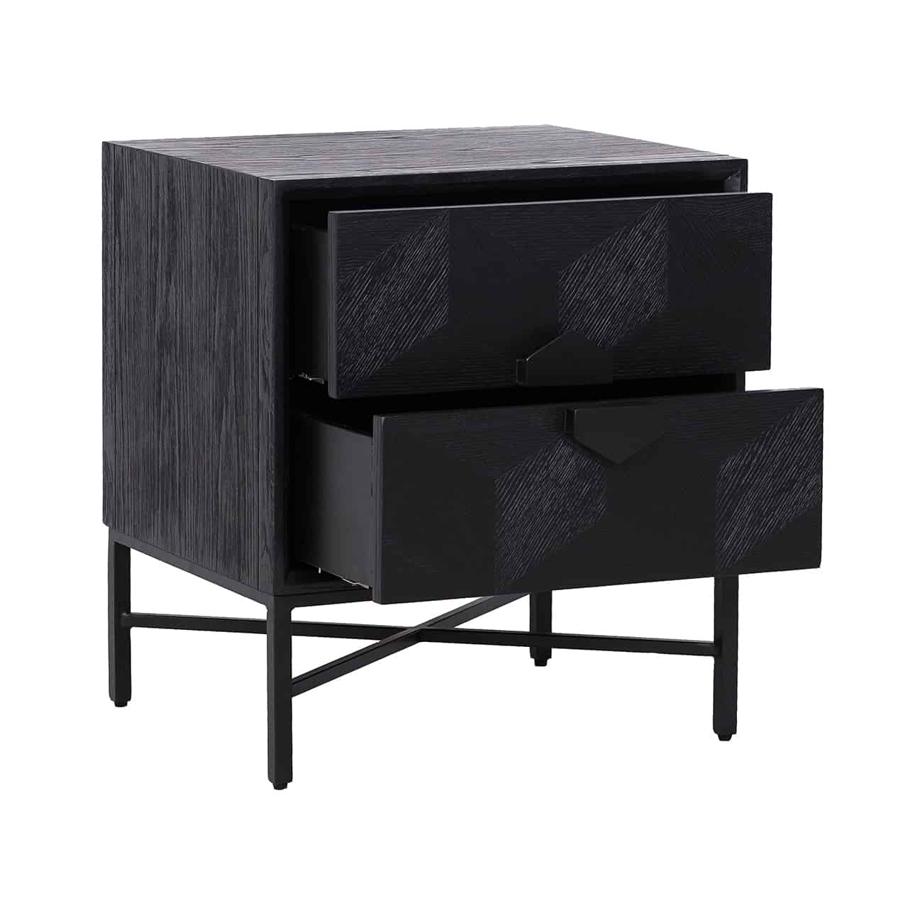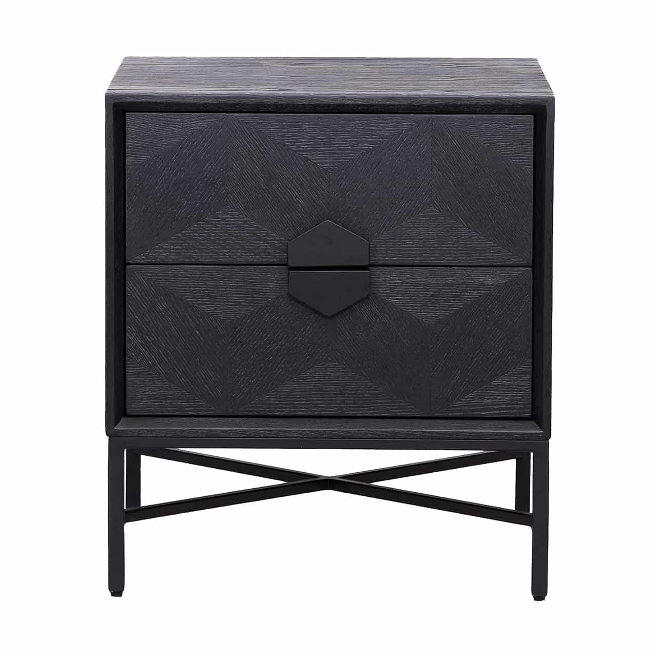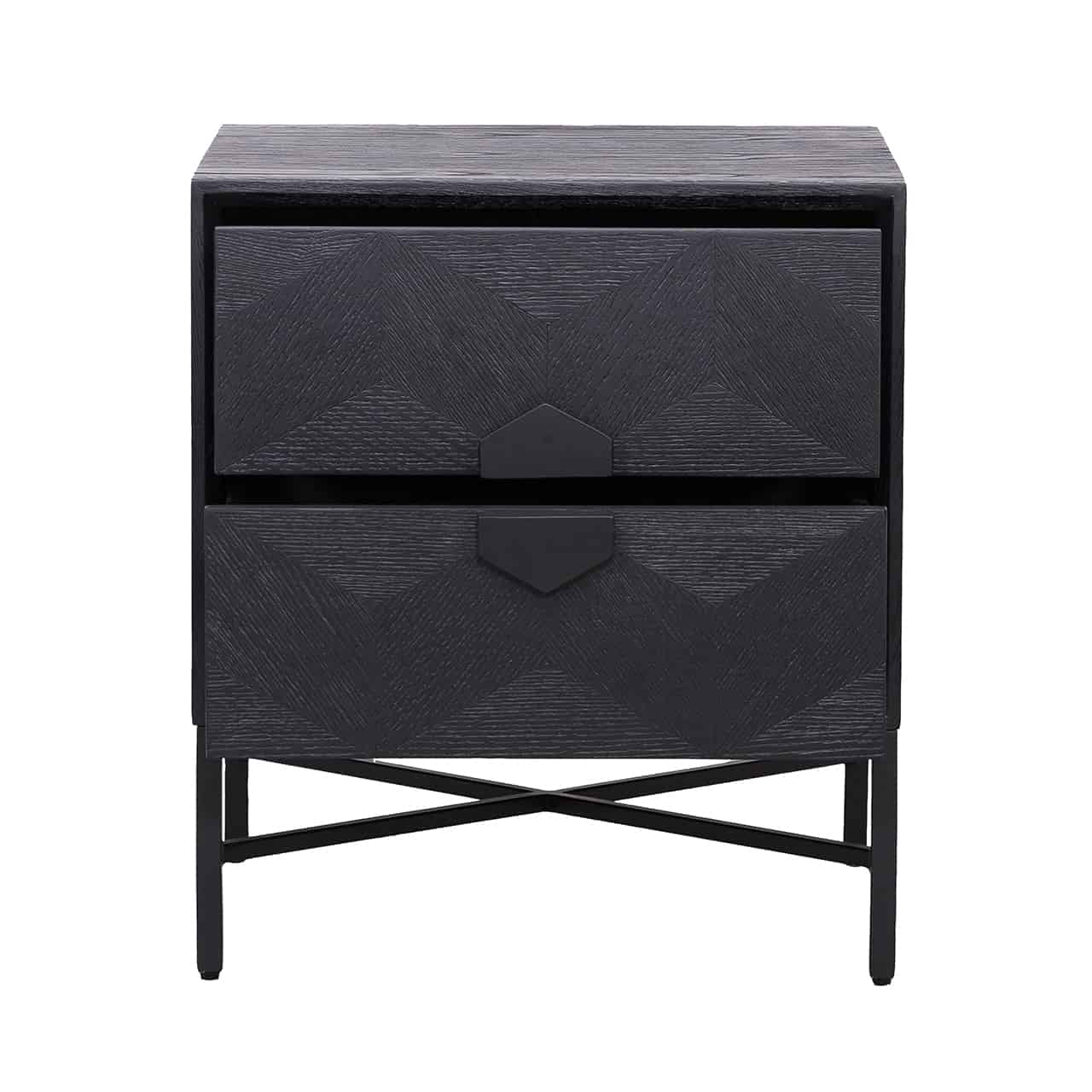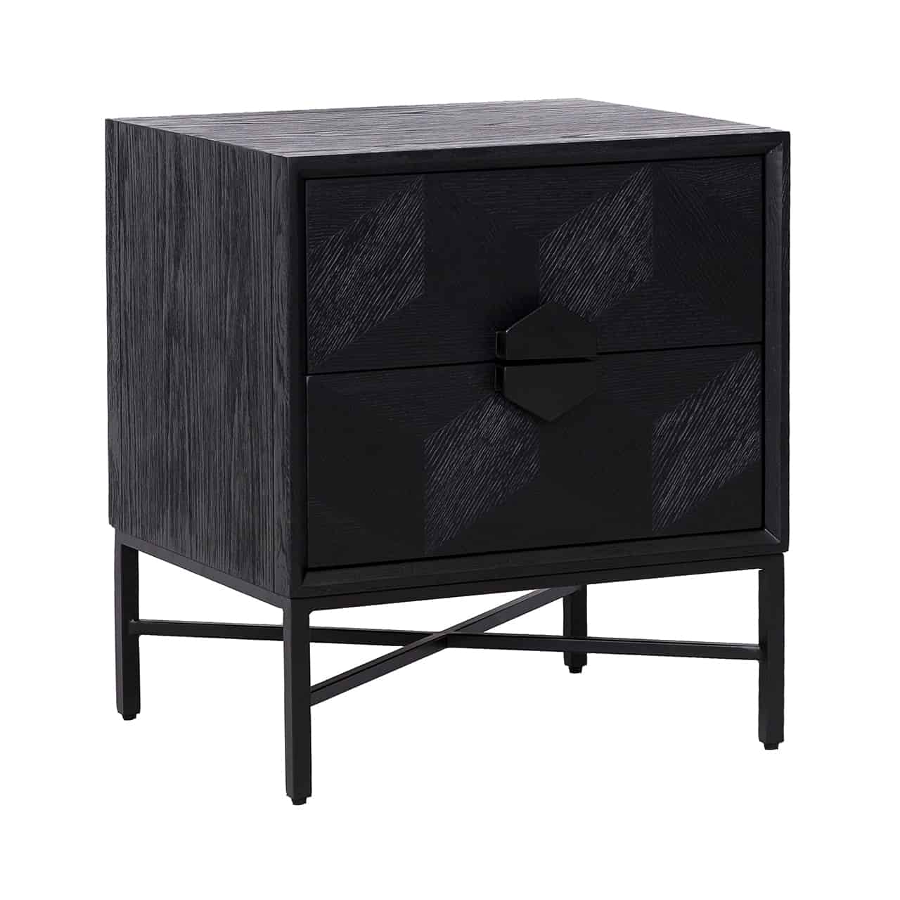 Richmond Interiors creëert stijlvolle meubelen en accessoires die net zo uniek zijn als jij. Elke collectie staat garant voor een moderne uitstraling met een chique touch. Wat de Blax-collectie kenmerkt, zijn de geometrische vormen op de deuren en toppen. Ladekast Blax heeft een prachtige combinatie van rustiek zwart geborsteld eikenfineer met strakke, zwart gelakte metalen onderstellen.
