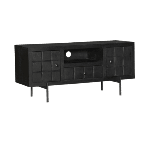 €279,00Tv meubel Brandy Black is uitgevoerd in mangohout met een metalen poot. Dit model is voorzien van één open vak, één deurtje en één lade. Het tv meubel is ingelegd met verschillende stroken zwart gelakt hout. Het ingesneden blokken patroon geeft de woonserie Brandy Black van Starfurn een unieke uitstraling.