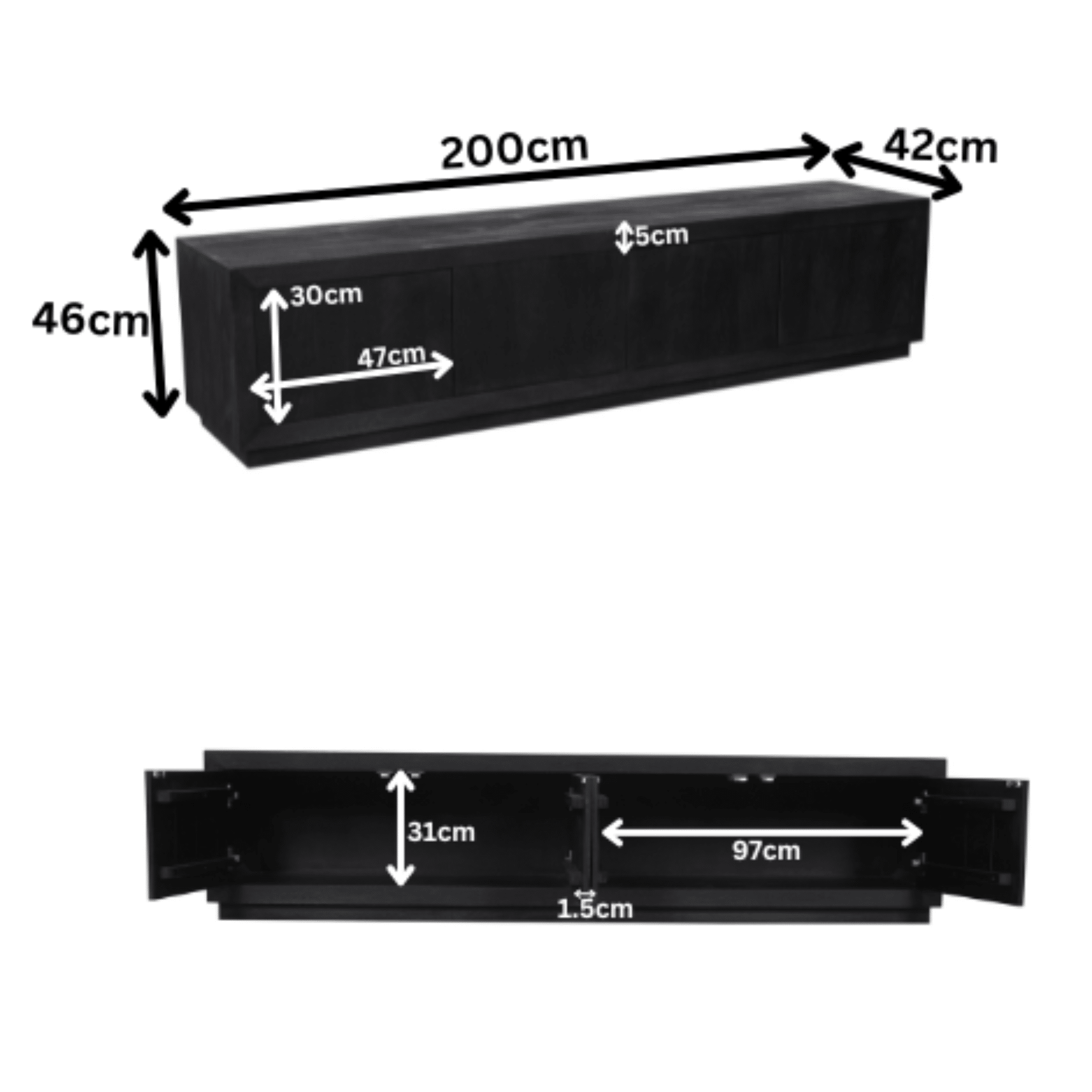 €709,00TV-meubel Brussel Black is gemaakt mangohout en afgewerkt met een verfijnde black finish. Dit meubelstuk straalt stijl uit dankzij het strakke en eigentijdse design. Met vier greeploze deuren, voorzien van een handig push-to-open systeem, biedt dit meubel niet alleen een moderne uitstraling maar ook functionele opbergruimte voor al je media-apparatuur.