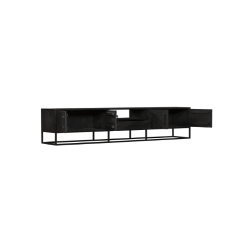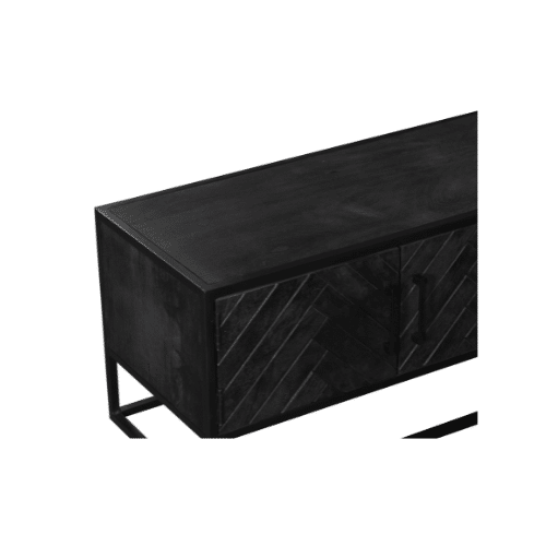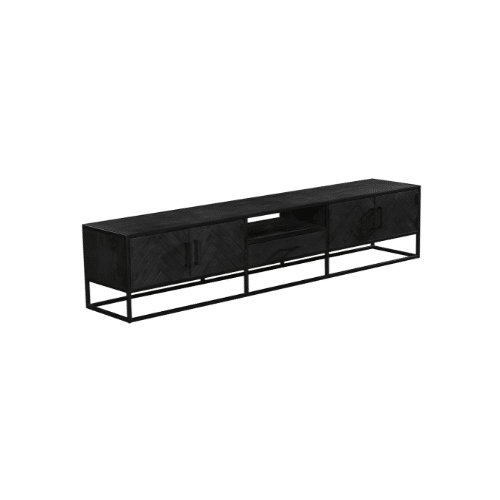 €799,00Tv meubel ‘New York’ is gemaakt van gezandstraald mangohout. Het metalen frame en de metalen handgrepen zijn afgewerkt met een zwarte lak. Dit model is voorzien van vier deuren, één lade en een open vak. Het hout is ingelegd in een visgraatpatroon en is afgewerkt met een zwarte lak.