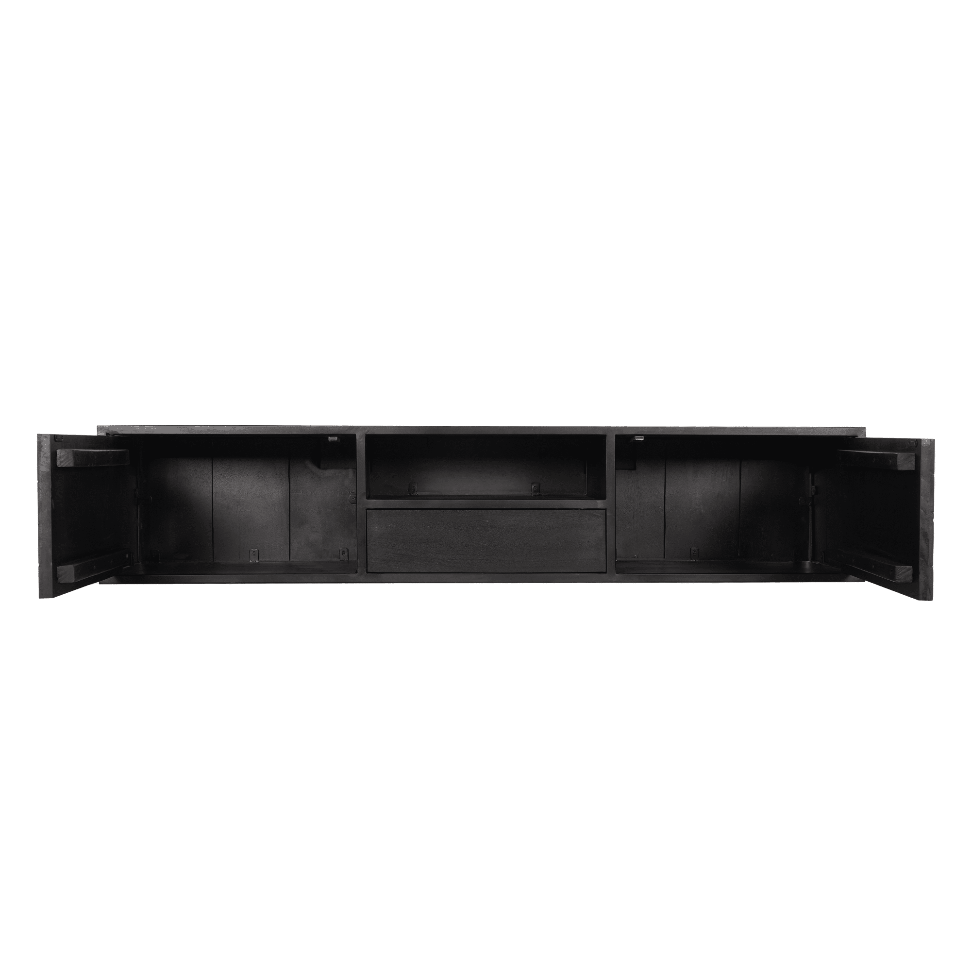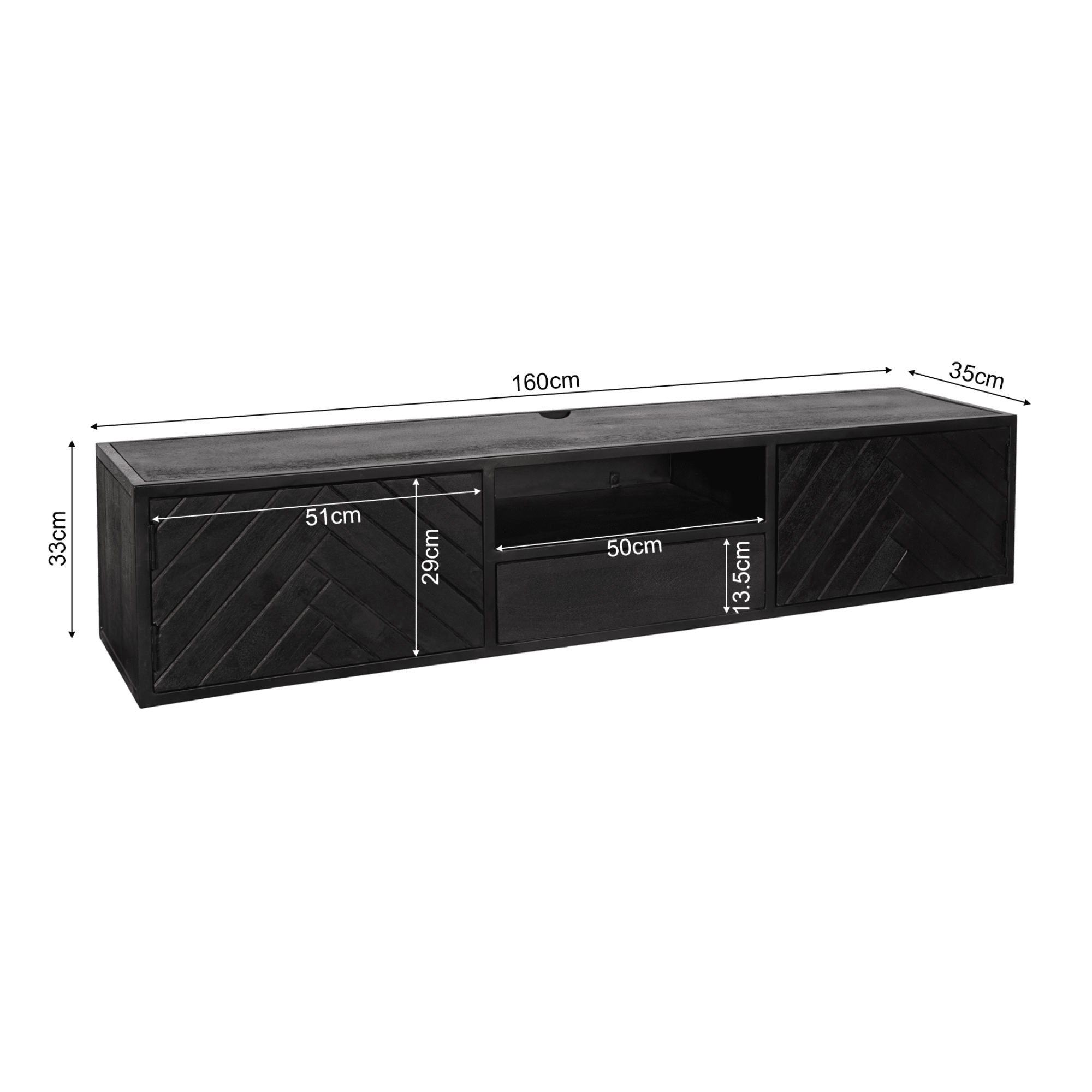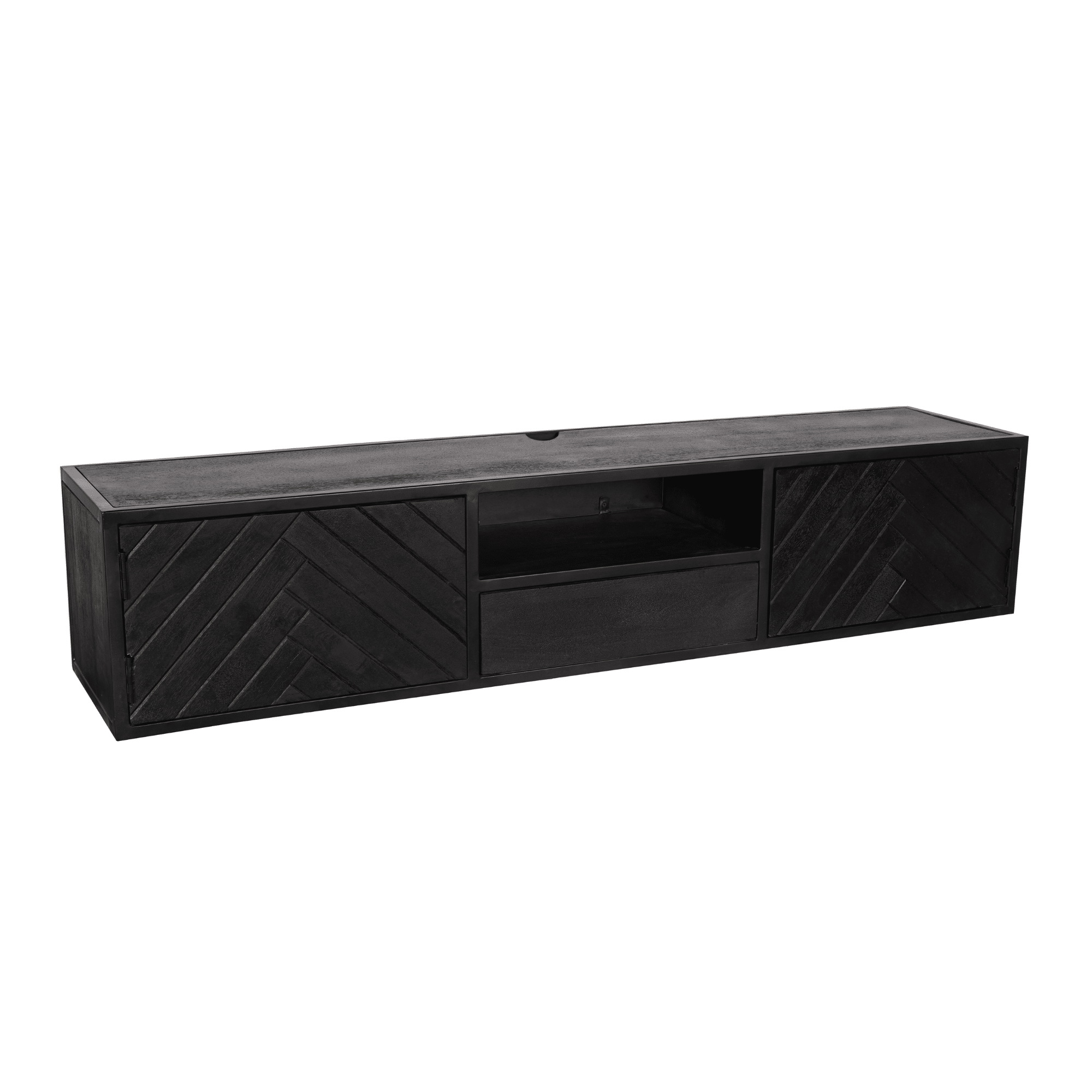 €429,00Dit stijlvolle zwevende TV-meubel is gemaakt van gezandstraald mangohout en afgewerkt met een moderne zwarte lak. De unieke visgraatpatroon aan de voorkant geeft een verfijnde touch, terwijl het open vak een praktische oplossing biedt om je spullen overzichtelijk en stijlvol op te bergen en tentoon te stellen. Een perfecte combinatie van elegantie en functionaliteit voor een strakke en moderne woonkamer!
