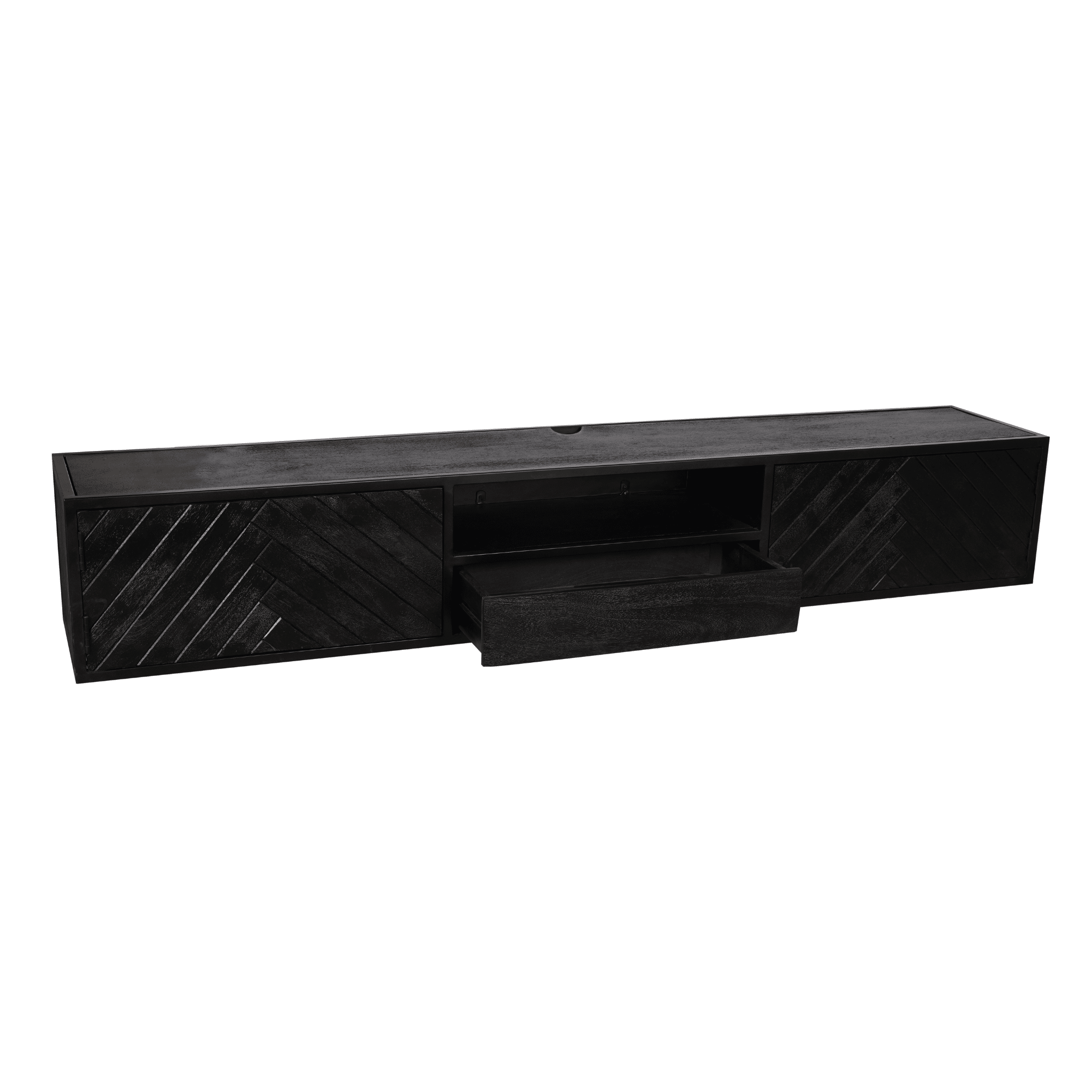 €529,00Dit stijlvolle zwevende TV-meubel is gemaakt van gezandstraald mangohout en afgewerkt met een moderne zwarte lak. De unieke visgraatpatroon aan de voorkant geeft een verfijnde touch, terwijl het open vak een praktische oplossing biedt om je spullen overzichtelijk en stijlvol op te bergen en tentoon te stellen. Een perfecte combinatie van elegantie en functionaliteit voor een strakke en moderne woonkamer!