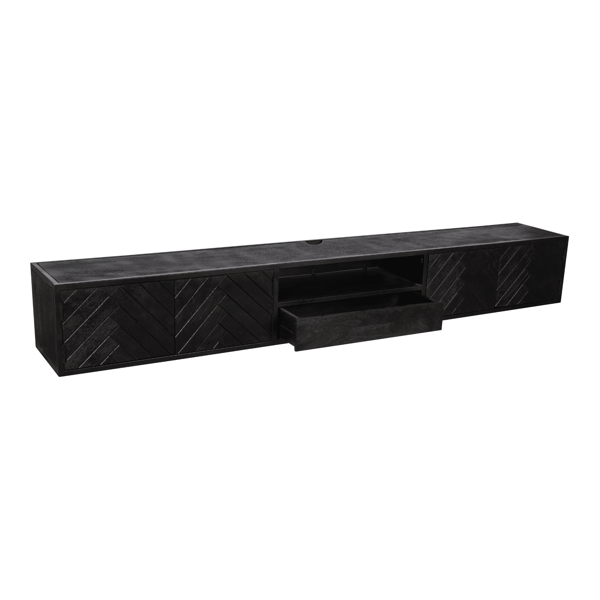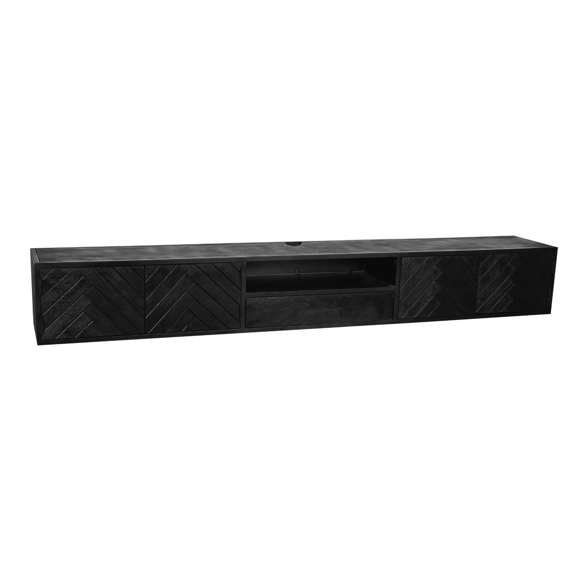 €749,00Dit stijlvolle zwevende TV-meubel is gemaakt van gezandstraald mangohout en afgewerkt met een moderne zwarte lak. De unieke visgraatpatroon aan de voorkant geeft een verfijnde touch, terwijl het open vak een praktische oplossing biedt om je spullen overzichtelijk en stijlvol op te bergen en tentoon te stellen. Een perfecte combinatie van elegantie en functionaliteit voor een strakke en moderne woonkamer!