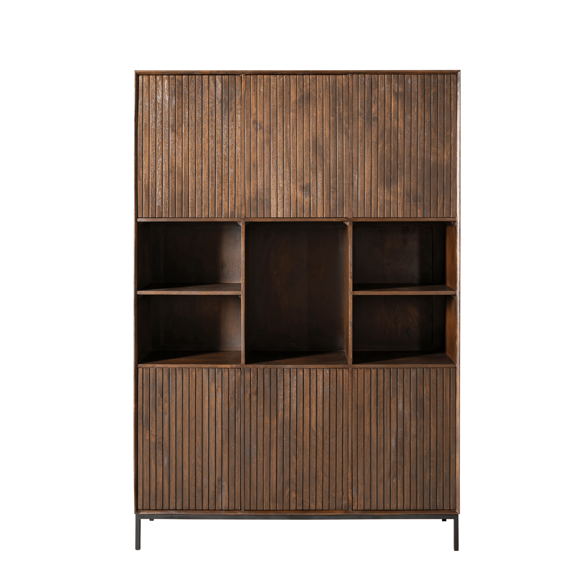 €1.349,00Vakkenkast XL ‘Madison’ is gemaakt van mangohout. Het metalen frame is afgewerkt met een zwarte lak. Dit model is voorzien van zes deuren en vijf openvakken. De deuren zijn voorzien van een verticaal lattenpatroon en is afgewerkt met een bruine finish.