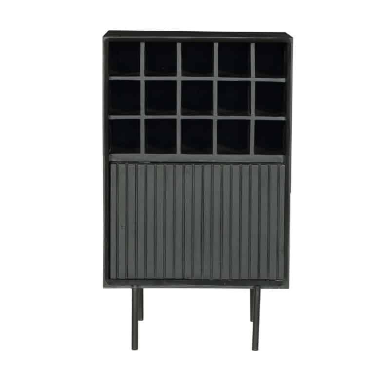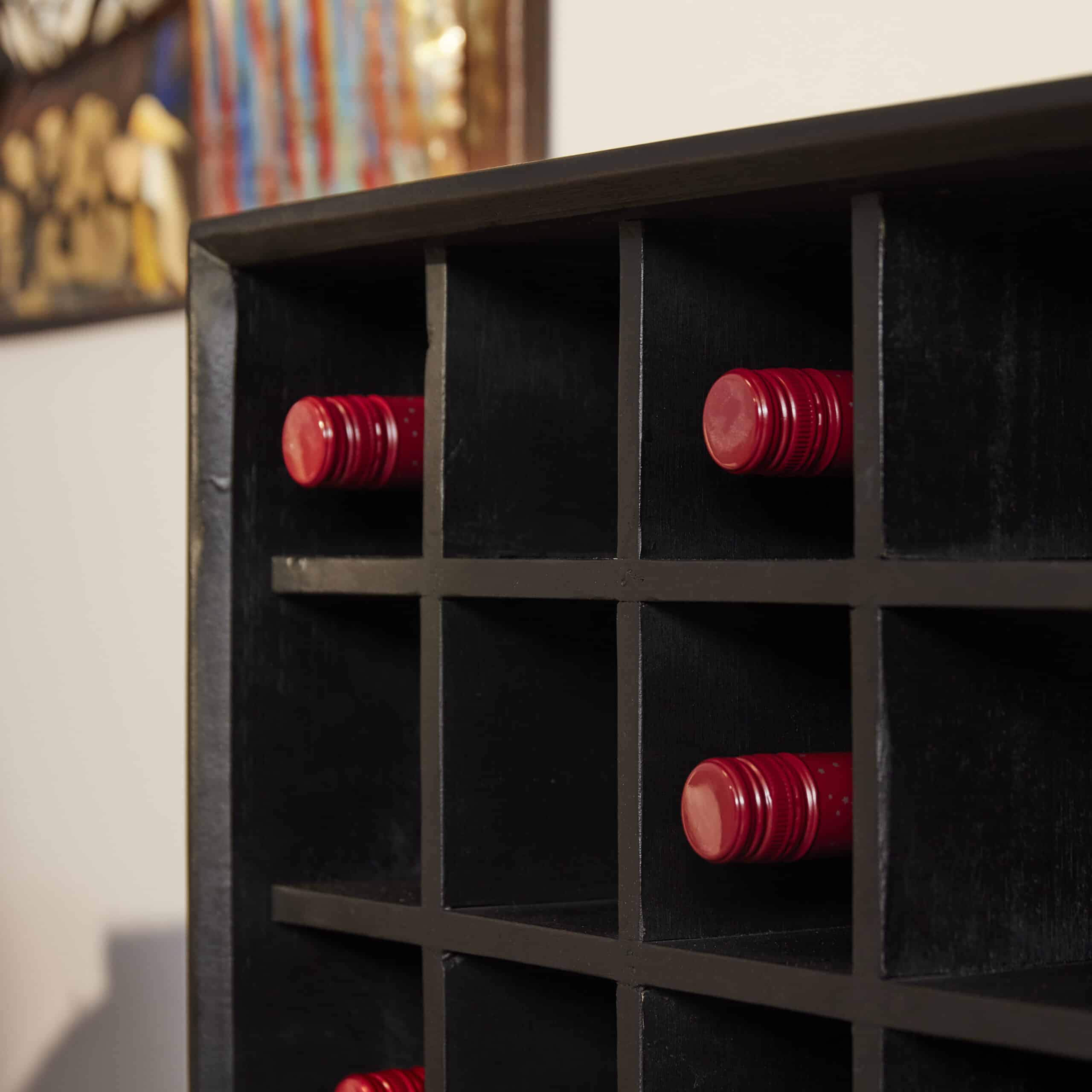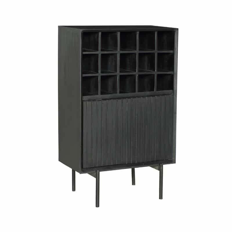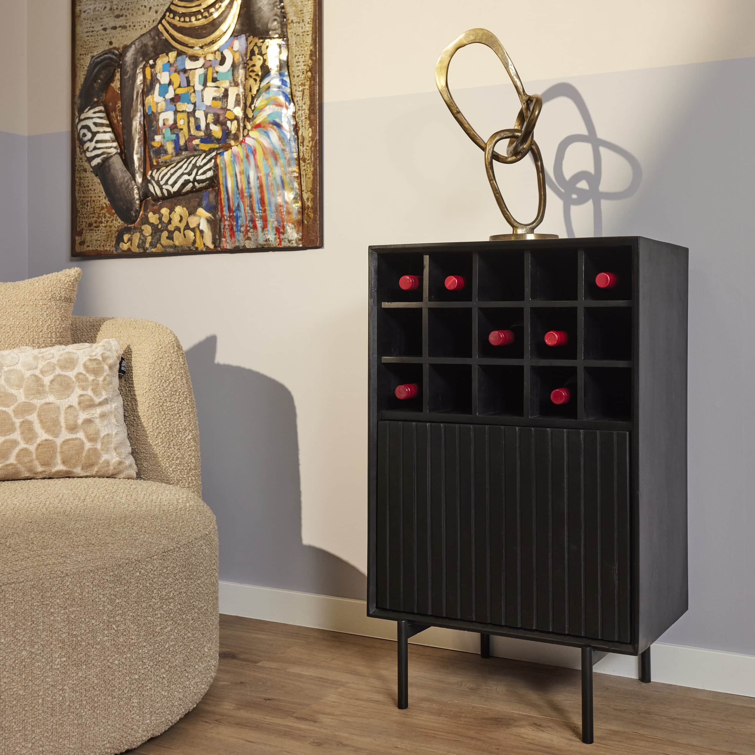 €329,00Wijnkast ‘Madison’ is gemaakt van mangohout. Het metalen frame is afgewerkt met een zwarte lak. Dit model is voorzien van een deur met daarachter een opbergvak en een 15 vakken voor wijnflessen. De lade is voorzien van een verticaal lattenpatroon en is afgewerkt met een zwarte lak.