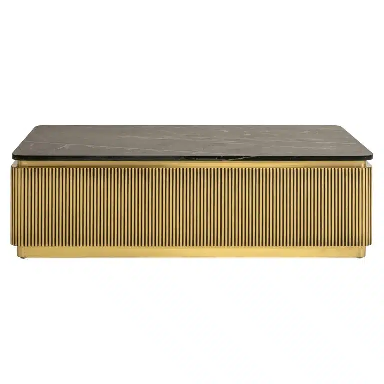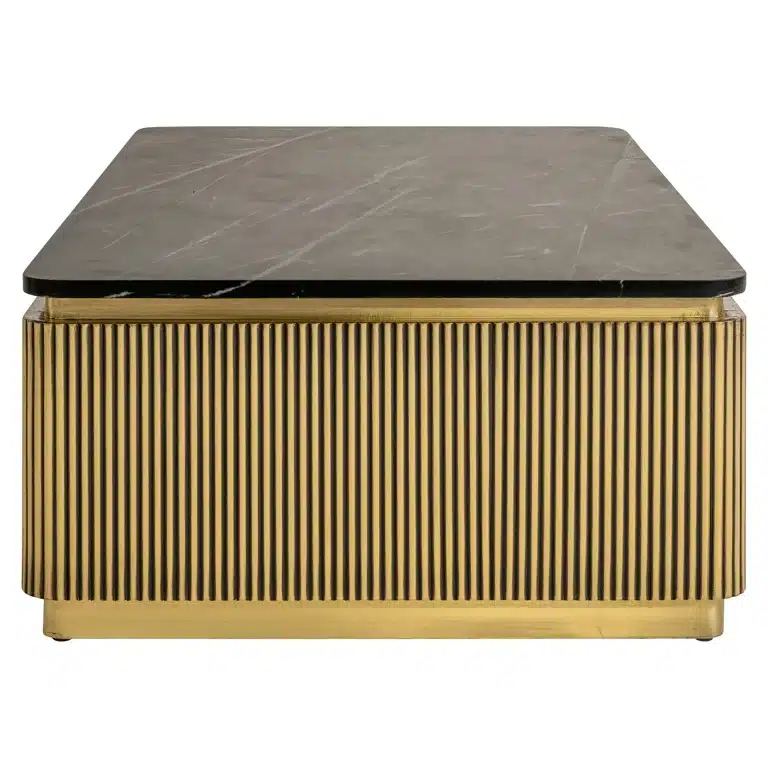 Richmond Interiors creëert stijlvolle meubelen en accessoires die net zo uniek zijn als jij. Elke collectie staat garant voor een moderne uitstraling met een chique touch. Salontafel Ironville heeft een warme, messingkleurige en luxe uitstraling look dankzij de strakke elementen in combinatie met de ribbels onderstel, zwarte frames en echt zwart marmeren bladen. Het messing plaatwerk wordt met de hand bekleed.