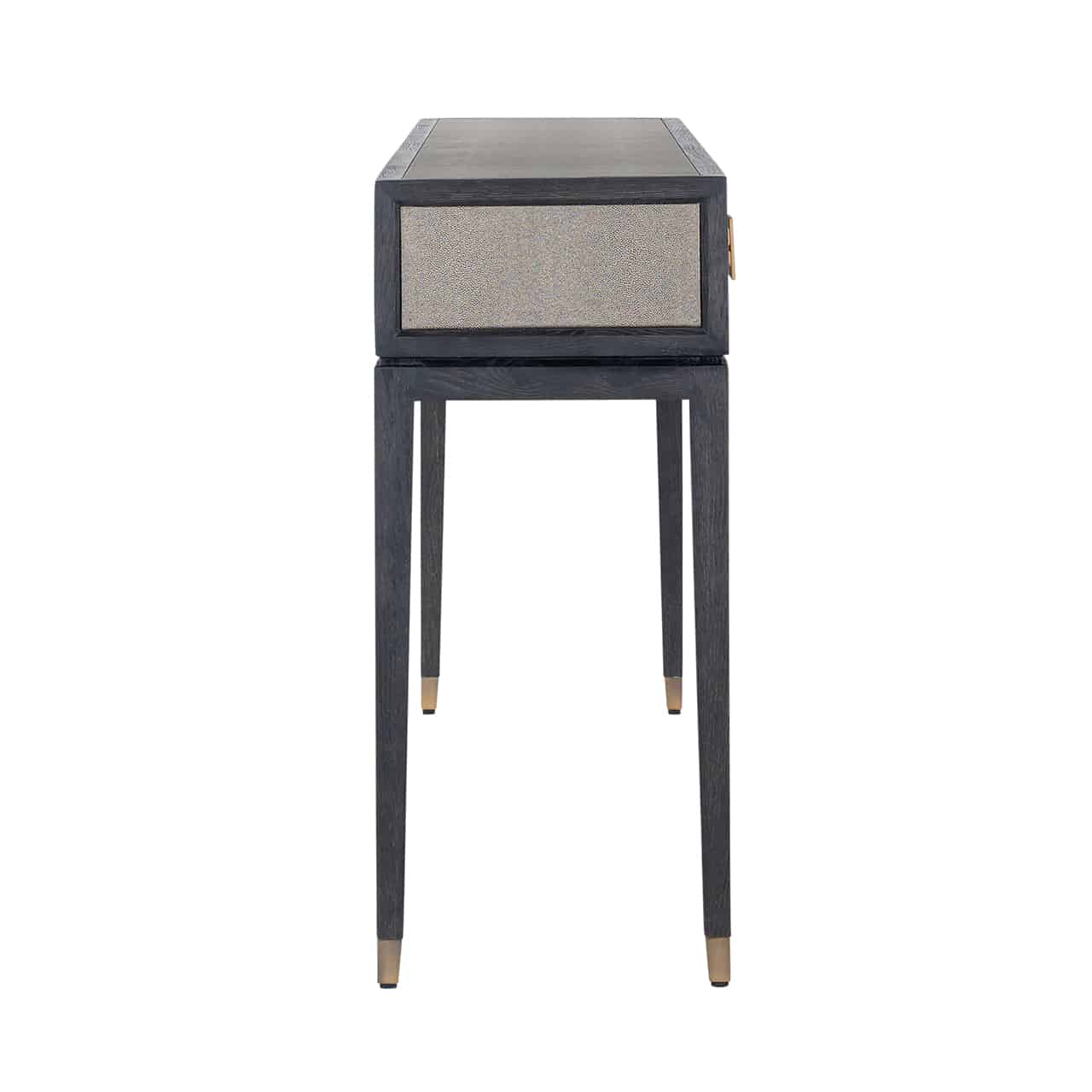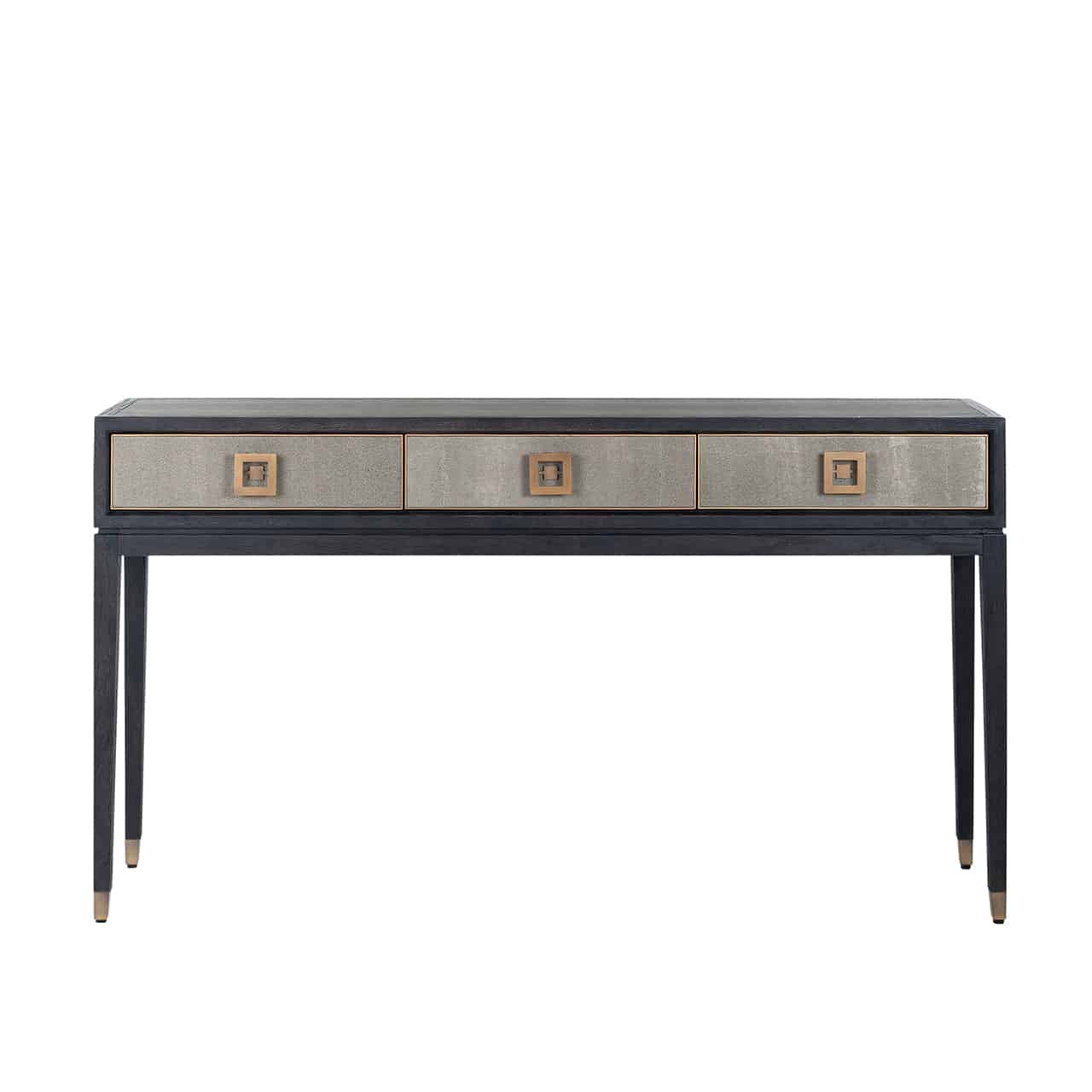 Richmond Interiors creëert stijlvolle meubelen en accessoires die net zo uniek zijn als jij. Elke collectie staat garant voor een moderne uitstraling met een chique touch. Dit zwart gebeitste eiken wandtafel gecombineerd met geometrisch gevormde, messingkleurige handgrepen en deuren zorgvuldig gedecoreerd met een replica van segrijnhuid, dat is de Bloomingville Collectie.