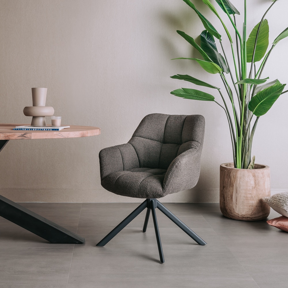 Wat deze stoel extra bijzonder maakt, is het 180° draaibare ontwerp, waardoor je eenvoudig kunt manoeuvreren en genieten van ultiem zitcomfort. De Alba is verkrijgbaar in drie andere kleuren bij Meubelcity: naast de warme bruine uitvoering zijn er nu ook trendy opties beschikbaar, waaronder elegant grijs, sfeervol naturel en tijdloos antraciet.