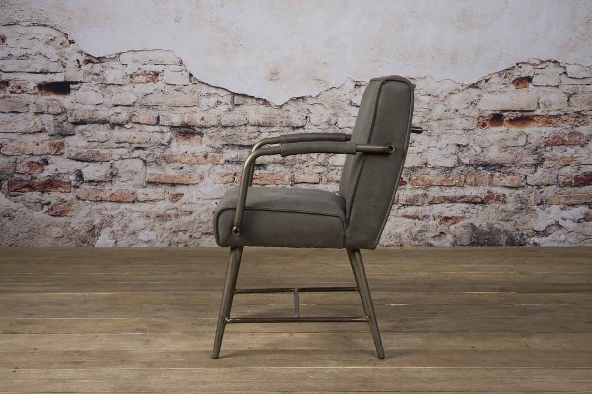 De industriële eetkamerstoel Belmonte met armleuningen van Tower Living bestaat uit en stoere, functionele stoel met een sterk en zelfverzekerd karakter. Industrieel staat voor een stoer en robuust design, soms met een heuse vintage look. De truc zit hem in het maken van de juiste combinaties en de kwaliteit van de materialen die gebruikt zijn. Uitgevoerd in de kleur grijs stof en metalen poten, ook hebben deze stoelen 1 handgreep op de achterzijde van de rugleuning.