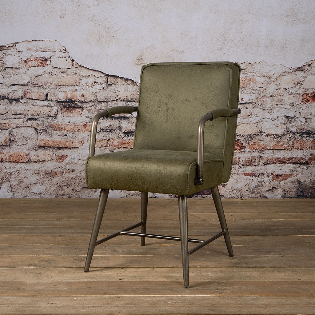 De industriële eetkamerstoel Belmonte met armleuningen van Tower Living bestaat uit en stoere, functionele stoel met een sterk en zelfverzekerd karakter. Industrieel staat voor een stoer en robuust design, soms met een heuse vintage look. De truc zit hem in het maken van de juiste combinaties en de kwaliteit van de materialen die gebruikt zijn. Uitgevoerd in de kleur groen stof en metalen poten, ook hebben deze stoelen 1 handgreep op de achterzijde van de rugleuning.
