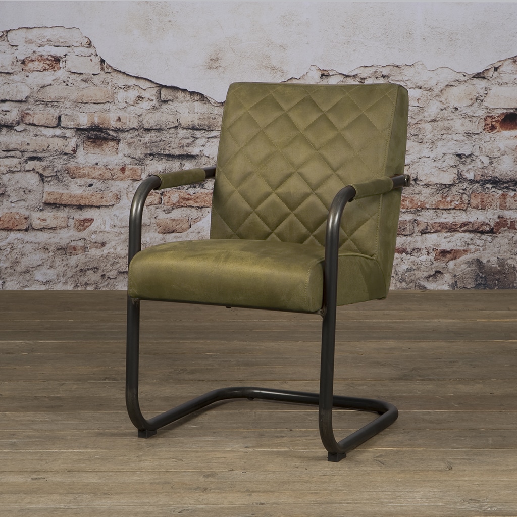 De industriële eetkamerstoel Civo met armleuningen van Tower Living bestaat uit en stoere, functionele stoel met een sterk en zelfverzekerd karakter. Industrieel staat voor een stoer en robuust design, soms met een heuse vintage look. De truc zit hem in het maken van de juiste combinaties en de kwaliteit van de materialen die gebruikt zijn. Uitgevoerd in de kleur groen microleder en metalen poten.