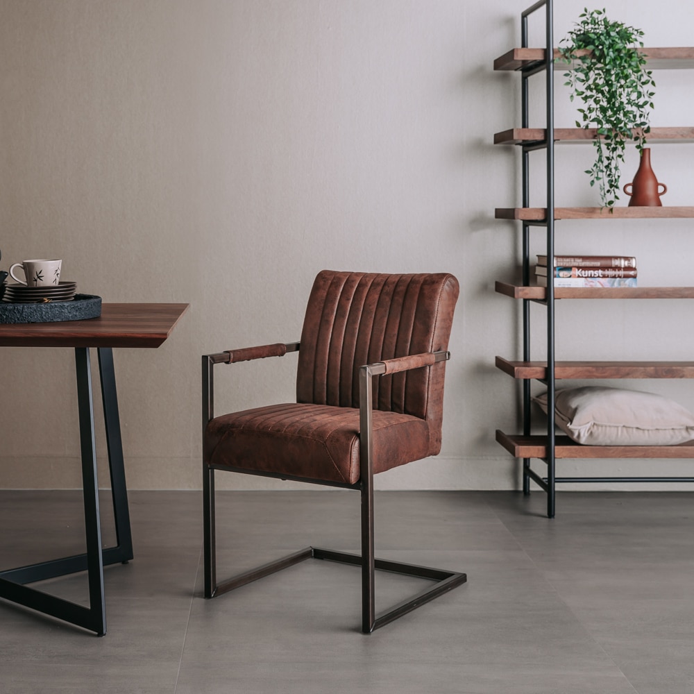 De industriële eetkamerstoel Ferro met armleuningen van Tower Living bestaat uit en stoere, functionele stoel met een sterk en zelfverzekerd karakter. Industrieel staat voor een stoer en robuust design, soms met een heuse vintage look. De truc zit hem in het maken van de juiste combinaties en de kwaliteit van de materialen die gebruikt zijn. Uitgevoerd in de stof donkerbruin en metalen poten.