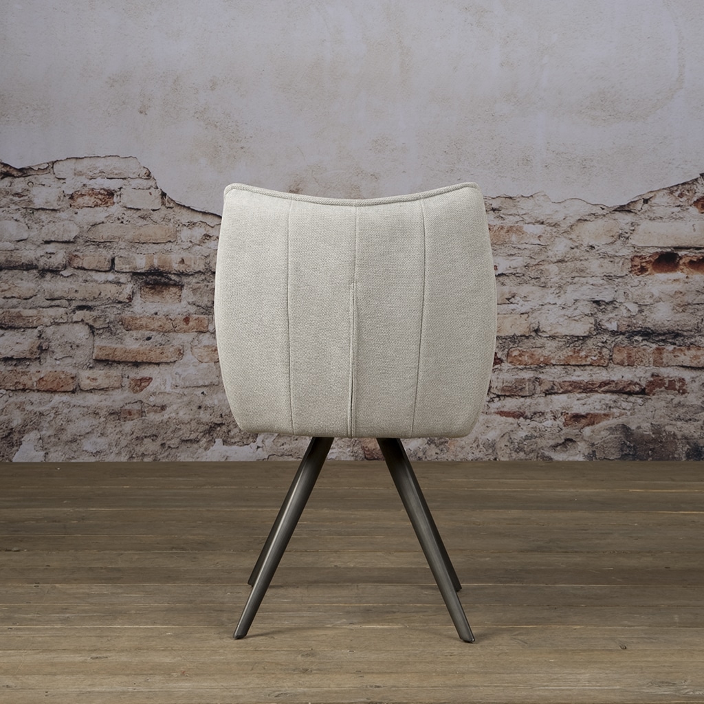 De Riviera eetkamerstoel is een meesterwerk van kwaliteit en stijl. Het is 180° draaibaar, waardoor je flexibiliteit hebt in het gebruik ervan. Of je nu wilt draaien om te converseren of om gemakkelijk op te staan, deze stoel past zich aan aan jouw behoeften. De zitting is bekleed met hoogwaardige lichtgrijze stof, wat niet alleen comfortabel is maar ook een eigentijdse uitstraling geeft. De metalen poten dragen bij aan de industriële esthetiek en zorgen voor duurzaamheid.