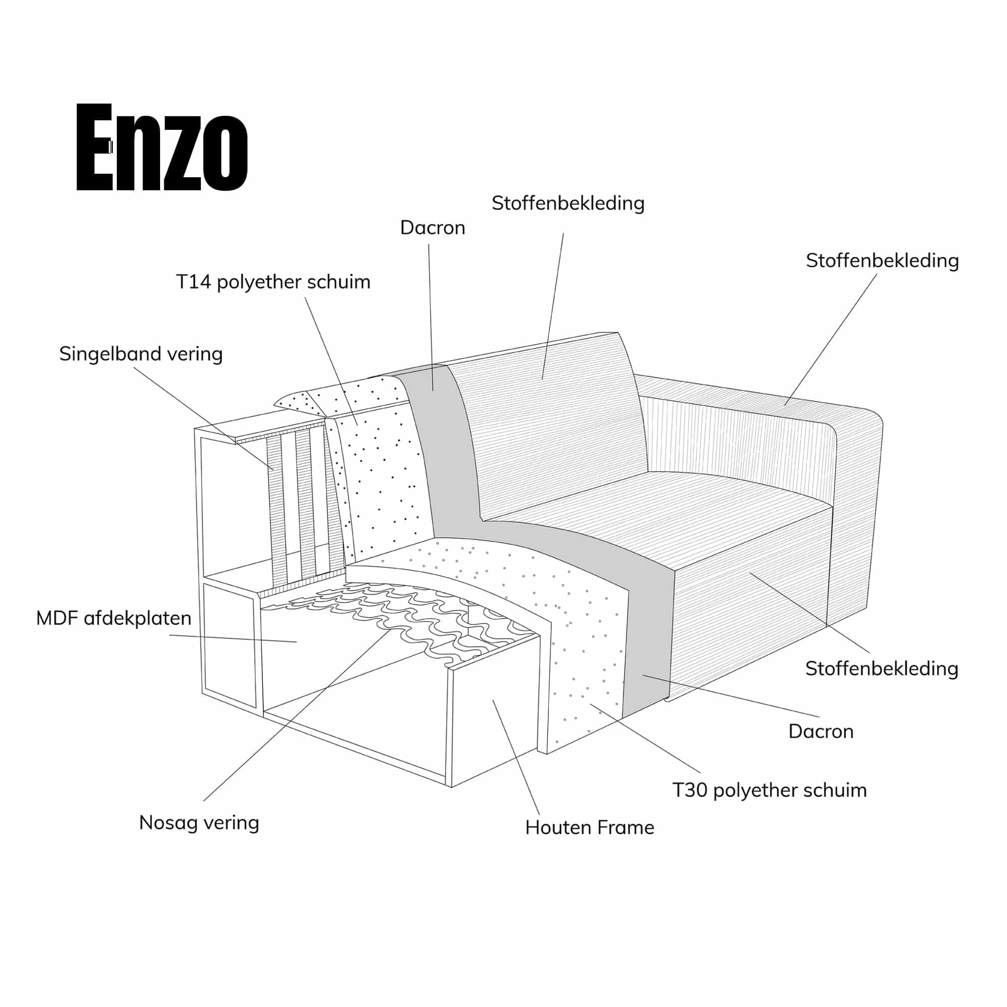 Maar het gaat niet alleen om stijl; de Enzo loungebank is gebouwd met een focus op ongeëvenaard comfort. Dankzij de hoogwaardige nosag veren en het ondersteunende polyetherschuim geniet je van een ergonomische zitervaring die zijn gelijke niet kent. Of je nu geniet van een avondje ontspanning na een lange dag werken of gezellig tijd doorbrengt met vrienden en familie, deze bank biedt de perfecte plek om tot rust te komen.